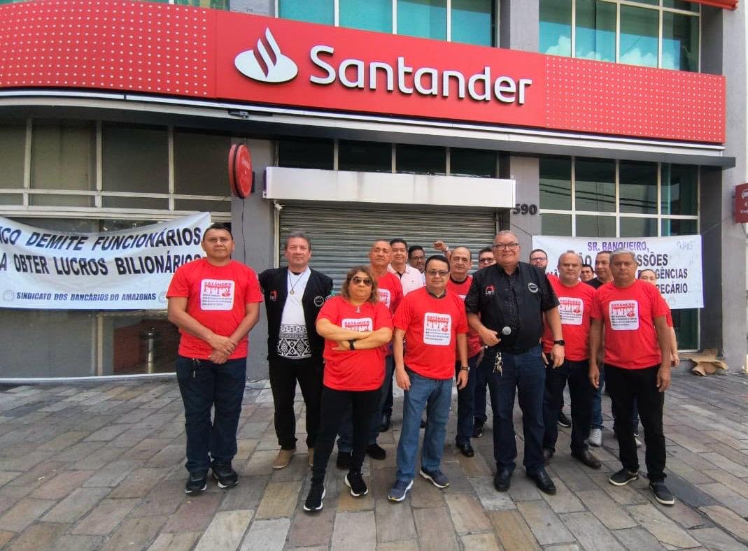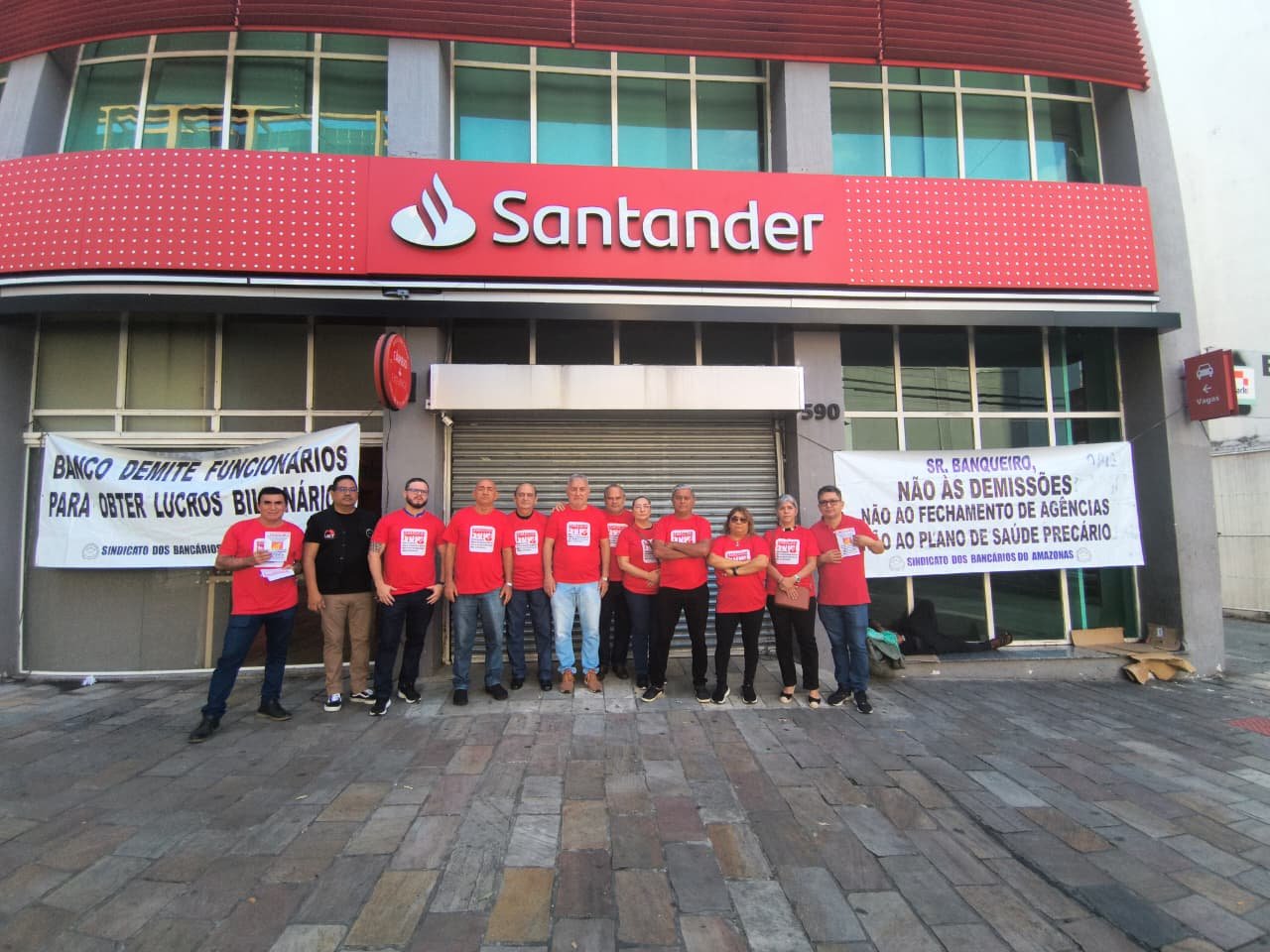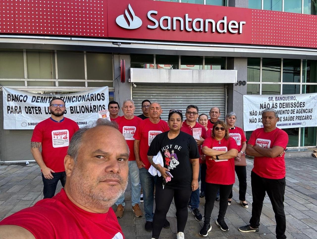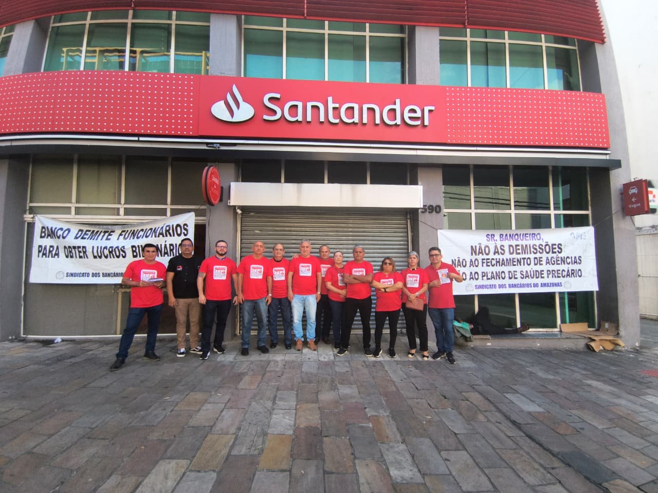 Bancários do Amazonas protestam contra demissões e fechamento de agências do Santander.