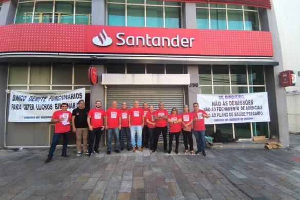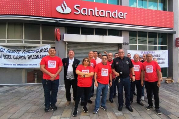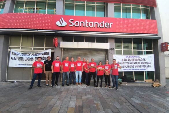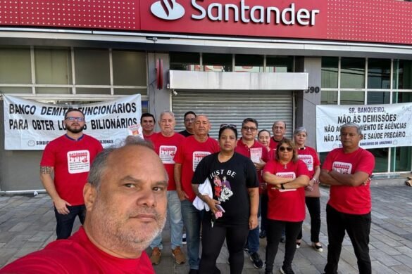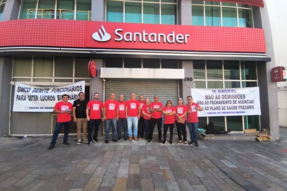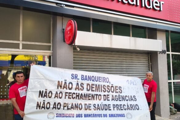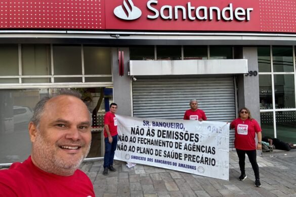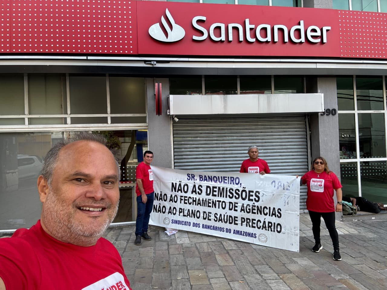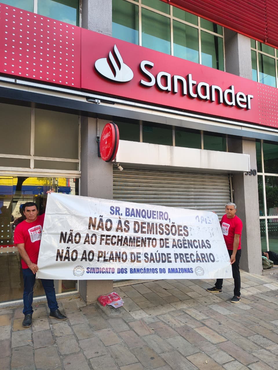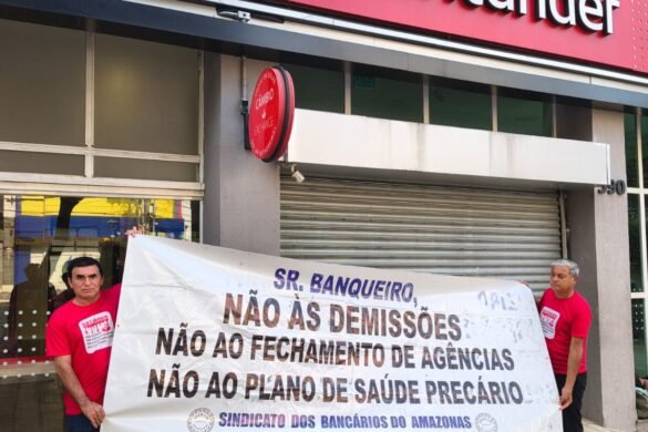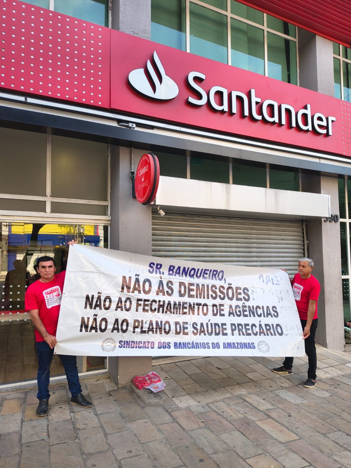 Na manhã desta sexta-feira (03/10), o Sindicato dos Bancários do Amazonas realizou uma manifestação em frente à Superintendência do Santander, na Avenida Eduardo Ribeiro, em Manaus (AM). Com faixas, os dirigentes sindicais denunciaram as demissões promovidas pelo banco e o fechamento de agências. O ato manteve o acesso à unidade adiado até as 10h da manhã, como forma de pressão contra as medidas adotadas pela instituição financeira. Entre as mensagens destacadas estavam: “Não às demissões”, “Não ao fechamento de agências” e “Não ao plano de saúde precário”. O sindicato destaca que o Santander tem registrado lucros bilionários às custas da redução de postos de trabalho e do enfraquecimento das condições de atendimento e de saúde de seus trabalhadores. A CONTEC seguirá ao lado da categoria na defesa dos empregos, da manutenção das agências e de condições dignas de saúde e trabalho.