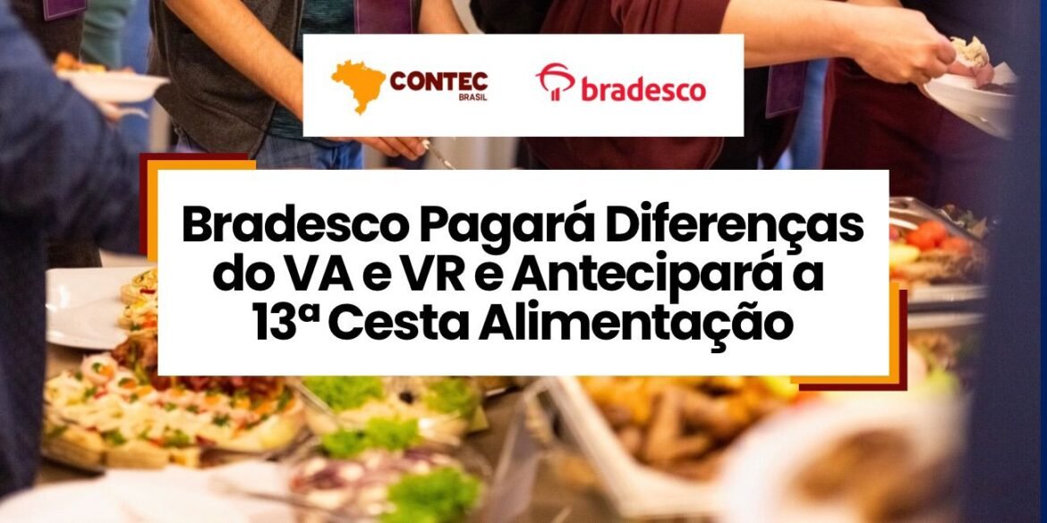 A 13ª cesta alimentação será paga no dia 10 de outubro, junto com o crédito das diferenças de VA e VR. O coordenador da COE (Comissão de Organização dos Empregados) CONTEC/Bradesco, Gladir Basso, manteve contato com Eduara Cavalheiro, gerente Departamental de Recursos Humanos do banco, e obteve a garantia de que o Bradesco fará o pagamento das diferenças do Vale Alimentação (VA) e do Vale Refeição (VR) nessa mesma data.