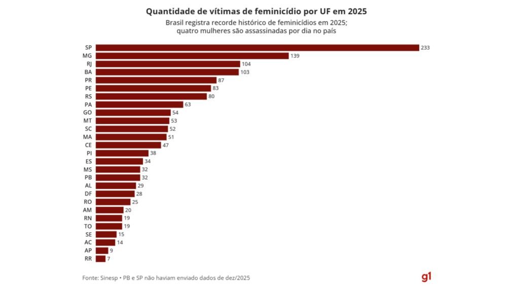 O número de feminicídios bateu recorde no Brasil em 2025: foram 1.470 casos de janeiro a dezembro, conforme dados do Ministério da Justiça e Segurança Pública. O total supera os 1.464 registros de 2024, a maior marca até então.