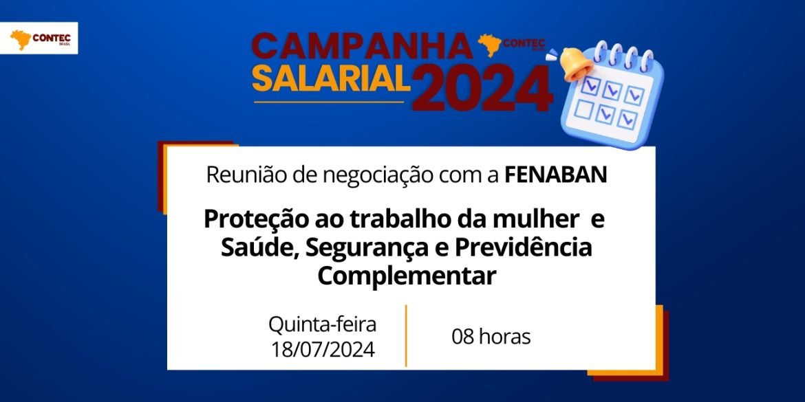 A quarta reunião de negociação entre a CONTEC e a Federação Nacional dos Bancos (FENABAN), será realizada nesta quinta-feira (18) em São Paulo, às 8 horas. Serão debatidas as cláusulas relacionadas à proteção ao trabalho da mulher e saúde, segurança e previdência complementar
