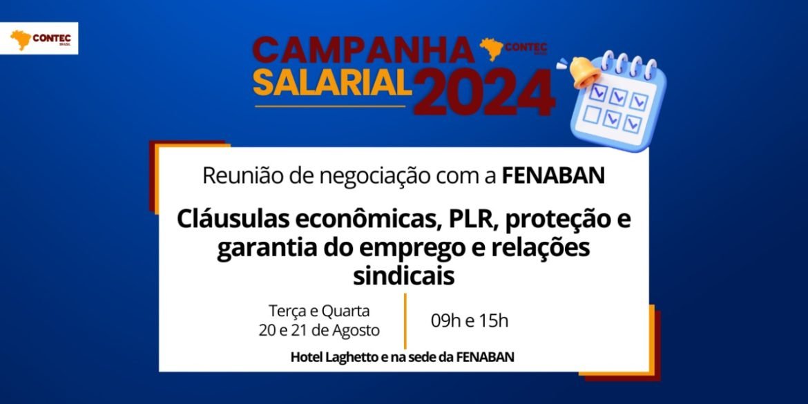 As próximas reuniões de negociação entre a Confederação Nacional dos Trabalhadores nas Empresas de Crédito (CONTEC) e a Federação Nacional dos Bancos (FENABAN) serão realizadas na próxima terça-feira (20), às 09h, no Hotel Laghetto e na quarta-feira (21), às 15h, na Sede Fenaban. Serão discutidas as cláusulas econômicas, PLR, proteção e garantia do emprego e relações sindicais.
