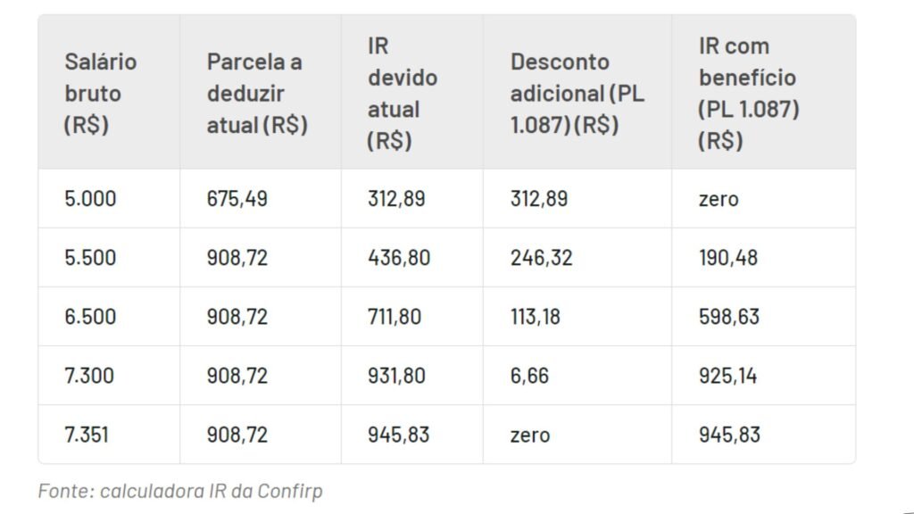 O benefício, no entanto, não para nos R$ 5 mil. O PL 1.087/25 também prevê que quem ganha entre R$ 5.001 e R$ 7.350 será contemplado com um desconto adicional progressivo.