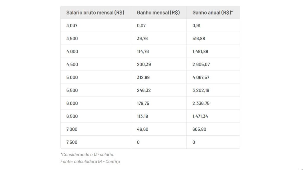 O ganho para quem tem salário de R$ 5 mil será o maior de todos, de R$ 312,89 por mês, equivalente a um adicional de renda de R$ 4.067 no ano, considerando o décimo terceiro salário.