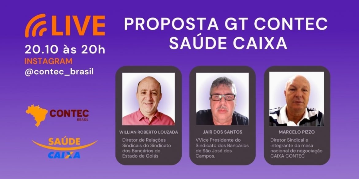 A CONTEC promove nesta quarta-feira (20) live para debater o plano de SAÚDE CAIXA. O debate será transmitido pelo Instagram @contec_brasil a partir das 20h. É importante a participação de todos os empregados do banco.