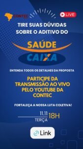 A CONTEC promove nesta terça-feira (11/11), às 18h, uma live pelo YouTube para esclarecer dúvidas sobre a Proposta de Aditivo ao ACT Saúde Caixa.