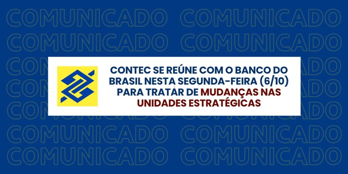 A CONTEC informa que participará, nesta segunda-feira, 6 de outubro de 2025, de reunião com a direção do Banco do Brasil para tratar de MUDANÇAS NAS UNIDADES ESTRATÉGICAS.