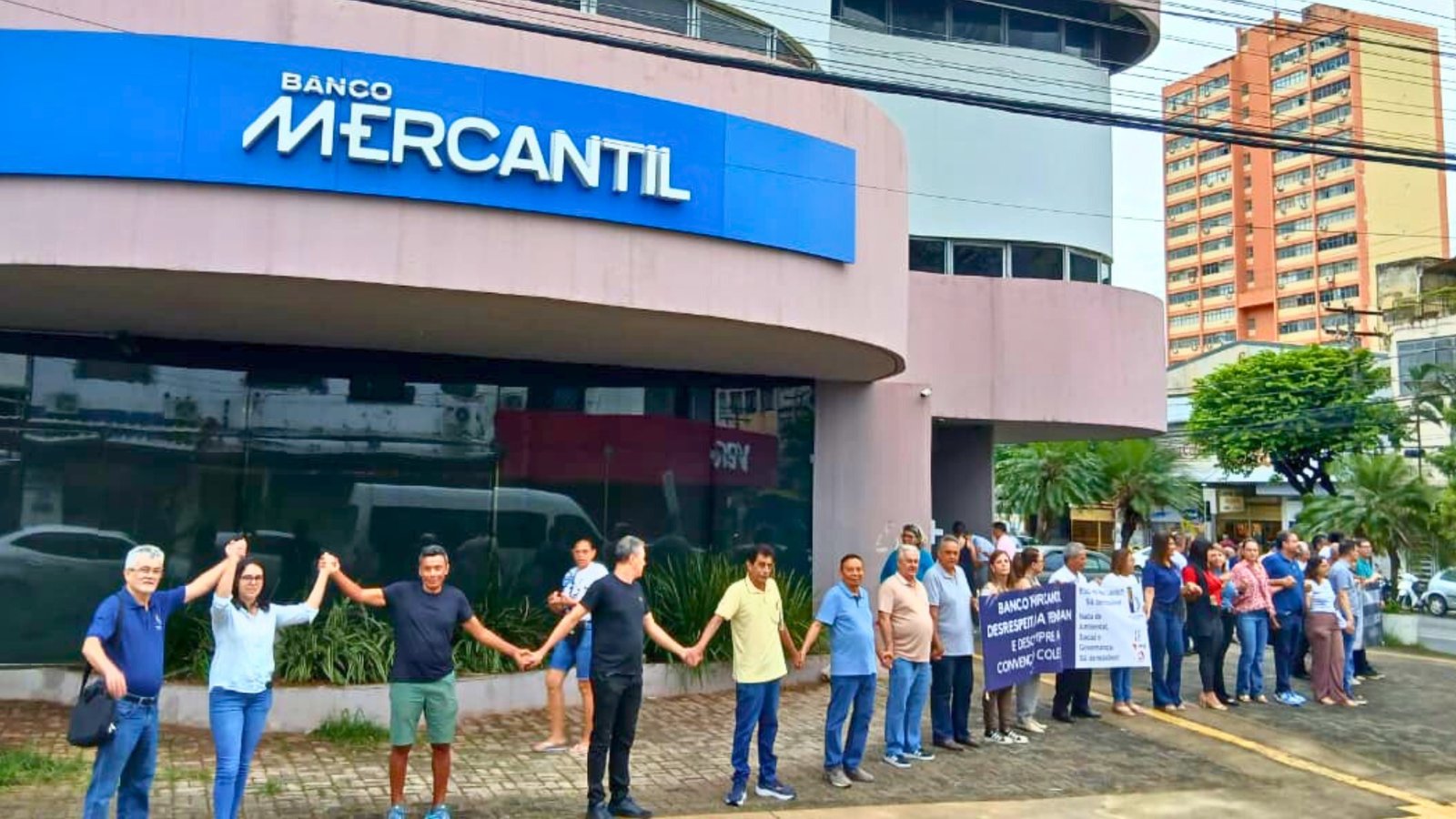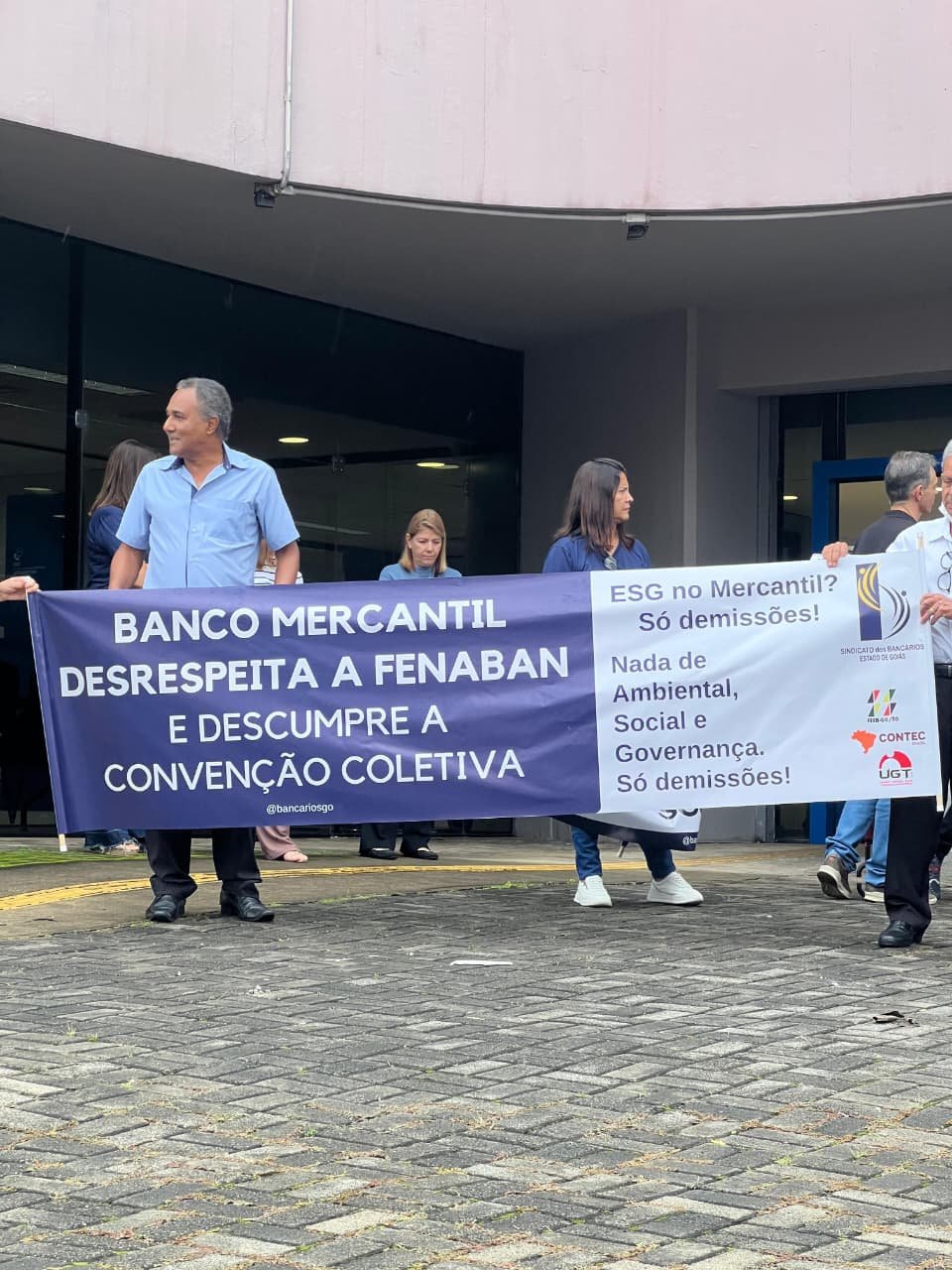 O Sindicato dos Bancários de Goiás realizou, nesta sexta-feira (30), um protesto em frente a uma agência do Banco Mercantil do Brasil, no Centro de Goiânia, em denúncia às recentes demissões promovidas pela instituição. A mobilização reuniu bancárias e bancários do Mercantil e contou também com a participação de trabalhadores de outras instituições financeiras, que se solidarizaram com os colegas atingidos.