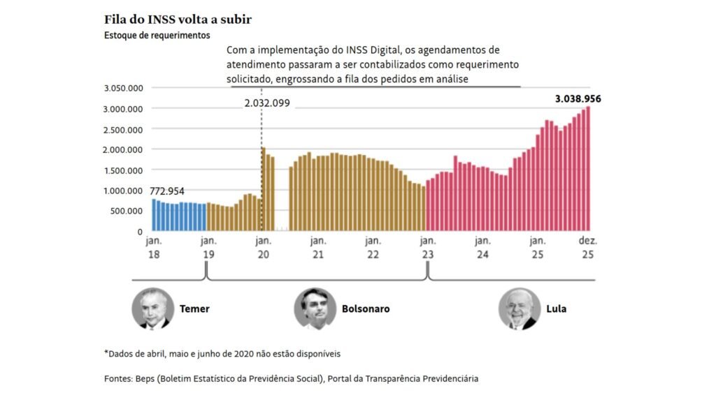 Desde o início do governo Lula, o máximo de redução mensal da fila que o INSS conseguiu num único mês foi de 156 mil, em agosto de 2023. Ao longo de todo o ano de 2025, a fila ficou acima de 2 milhões de pessoas em espera todos os meses.