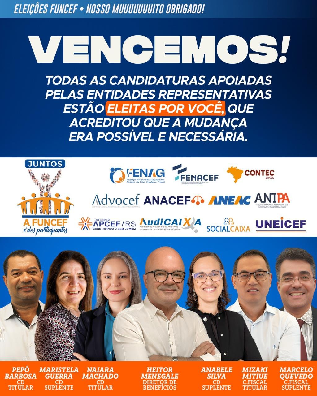 Os candidatos apoiados pela CONTEC e por entidades representativas — FENAG, FENACEF, ADVOCEF, ANACEF, ANEAC, ANIPA, APCEF/RS, AUDICAIXA, SOCIAL CAIXA e UNEICEF — foram eleitos, fortalecendo uma representação voltada à transparência, à sustentabilidade dos planos e à defesa dos direitos de todos.