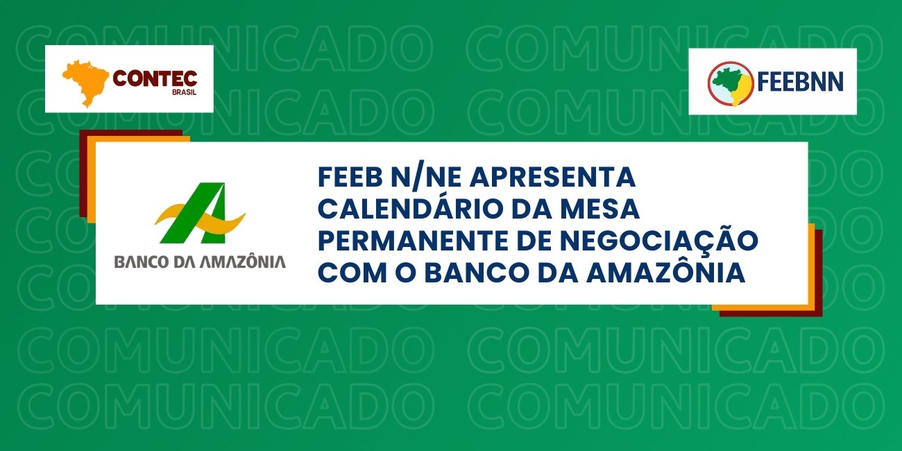 A Federação dos Empregados em Estabelecimentos Bancários do Norte e Nordeste (FEEB N/NE) encaminhou o calendário de reuniões e os temas propostos para a Mesa Permanente de Negociação com o Banco da Amazônia S/A, referente ao primeiro semestre de 2026, como sugestão de agenda, passível de inclusão de novos temas ao longo do período.
