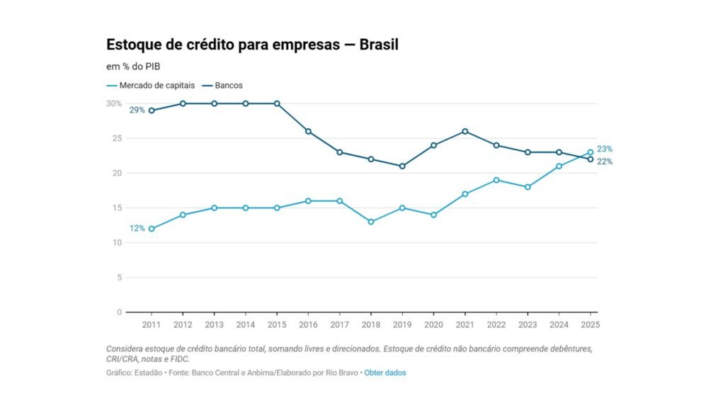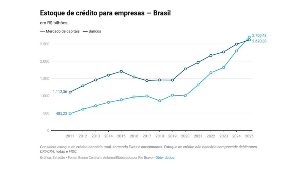 O mercado de capitais superou os bancos como fonte principal de crédito para as empresas pela primeira vez na história no Brasil, em 2025, segundo dados do Banco Central e da Associação Brasileira das Entidades dos Mercados Financeiro e de Capitais (Anbima) em estudo da Rio Bravo Investimentos.