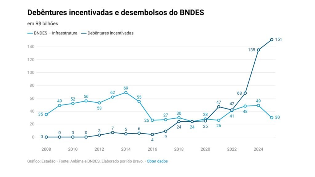 Tradicionalmente, projetos de longo prazo em setores como transporte, saneamento e energia elétrica dependiam de crédito subsidiado do Banco Nacional de Desenvolvimento Econômico e Social (BNDES). De 2023 para cá, as emissões privadas ultrapassaram os desembolsos públicos na área de infraestrutura.