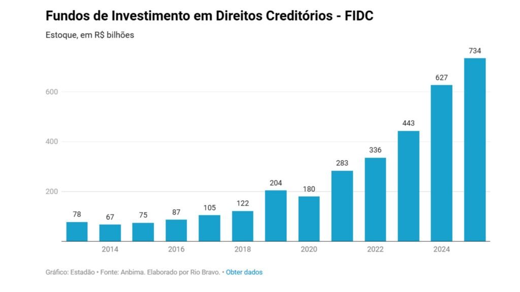 É o caso, por exemplo, de precatórios (que tramitam na Justiça) oriundos de ações contra a União, Estados e municípios e carteiras de empréstimos. Quem tem valores para receber vende o crédito e recebe um valor menor antecipadamente. Quem compra fica com aquele crédito e vende no mercado. O estoque de FIDCs no Brasil era de R$ 78 bilhões em 2013 e alcançou R$ 734 bilhões em 2025.