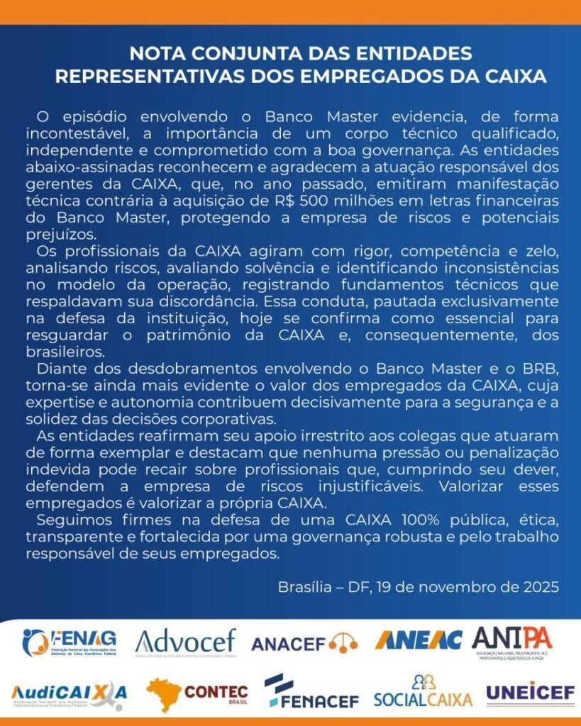 O episódio envolvendo o Banco Master evidencia, de forma incontestável, a importância de um corpo técnico qualificado, independente e comprometido com a boa governança. As entidades abaixo-assinadas reconhecem e agradecem a atuação responsável dos gerentes da CAIXA, que, no ano passado, emitiram manifestação técnica contrária à aquisição de R$ 500 milhões em letras financeiras do Banco Master, protegendo a empresa de riscos e potenciais prejuízos.