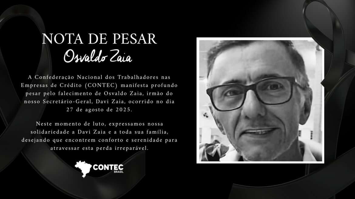 A Confederação Nacional dos Trabalhadores nas Empresas de Crédito (CONTEC) manifesta profundo pesar pelo falecimento de Osvaldo Zaia, irmão do nosso Secretário-Geral, Davi Zaia, ocorrido no dia 27 de agosto de 2025.