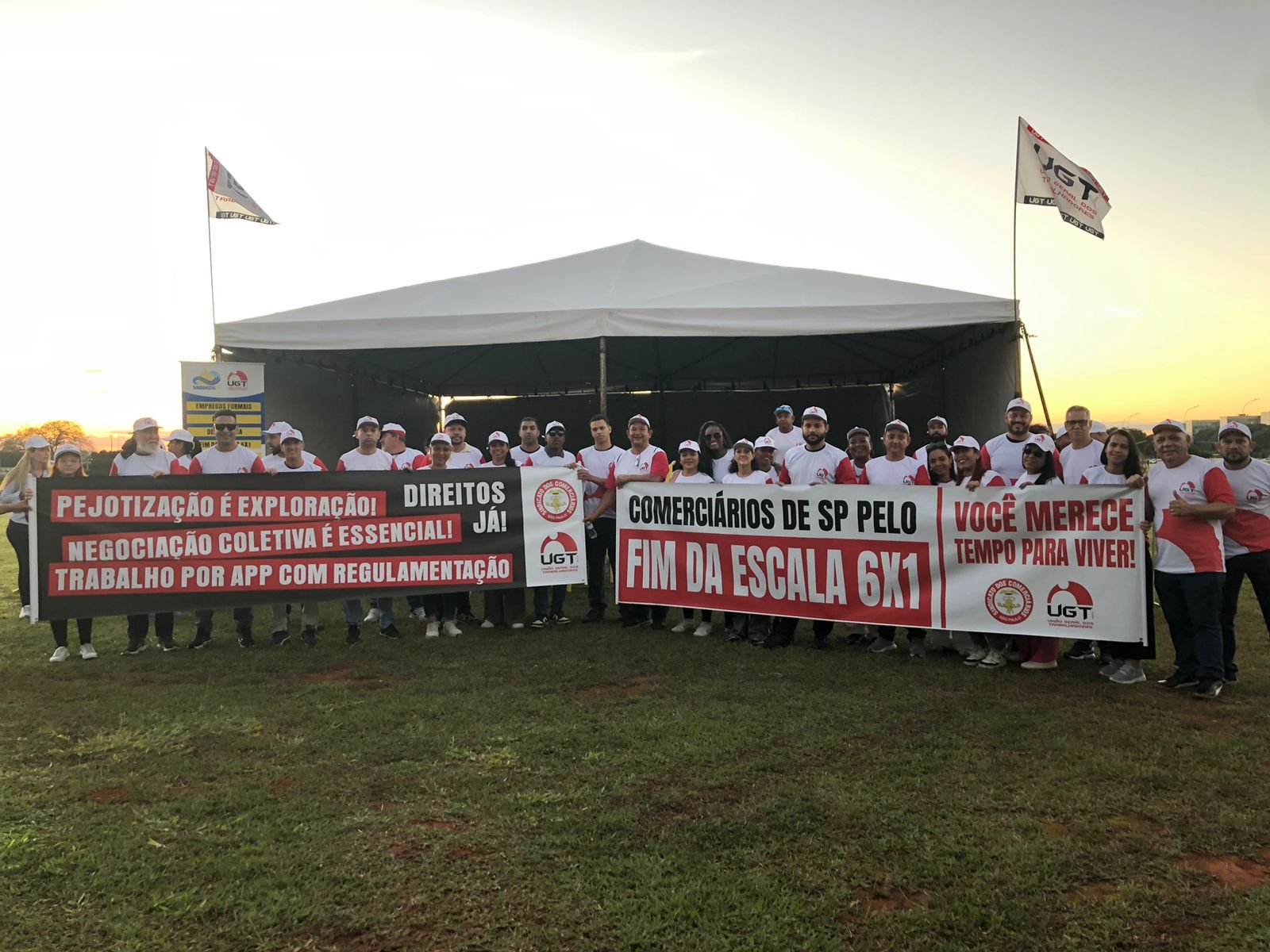 Trabalhadores e trabalhadoras de diversas categorias e regiões do país se concentram em frente ao Teatro Nacional para reforçar a luta por direitos, justiça social e valorização do trabalho.