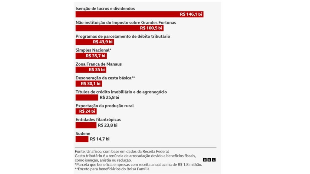 Nas contas da Associação Nacional dos Auditores Fiscais da Receita Federal do Brasil (Unafisco Nacional), em estudo inédito, esses valores devem chegar a R$ 618,4 bilhões em 2026 — ou quase quatro vezes o orçamento previsto para o Bolsa Família no próximo ano (R$ 158 bilhões).