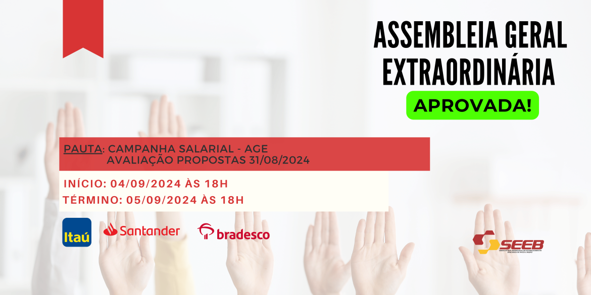 Comunicamos que em Assembleia Geral Extraordinária realizada através de votação virtual/remota, com link disponibilizado pelo site www.bancariospatospb.com.br e rede Social Whatsapp, com início as 18h do dia 04/09 e termino as 18h do dia 05/09, com os funcionários dos BANCOS PRIVADOS (Bradesco – Santander – Itaú), agências Patos e Santa Luzia (PB) foi constatado o seguinte RESULTADO: