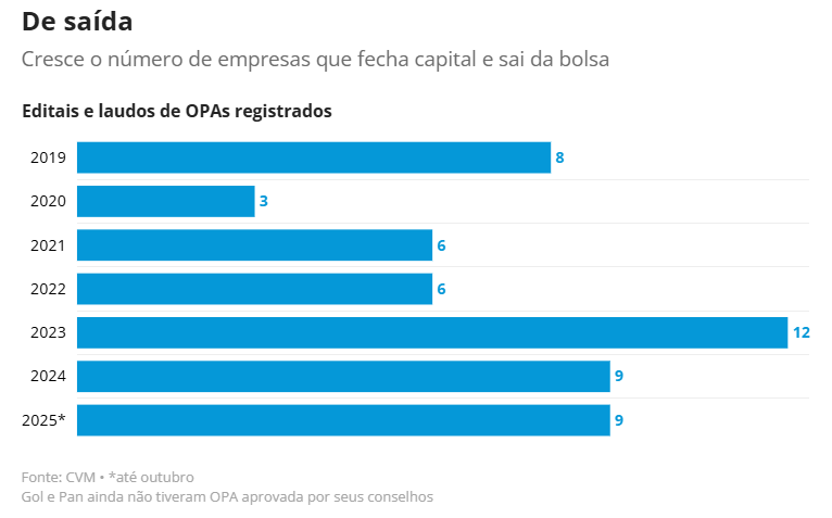 Só em 2025, nove companhias decidiram tirar seus papéis de circulação da Bolsa de São Paulo, a B3. Em paralelo, algumas empresas decidiram recomprar suas ações, o que tem contribuído para um volume menor dos papéis no mercado.