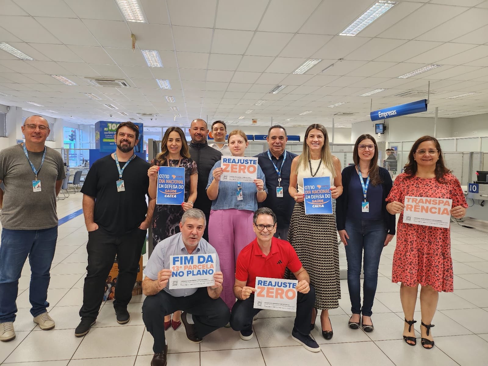 Durante este dia de mobilização, diretores do Sindicato de Cascavel e empregados da Caixa estão usando cartazes com os dizeres “07/10 – Dia Nacional em Defesa do Saúde Caixa”, “Fim da 13ª Parcela no Plano”, “Transparência” e “Reajuste Zero”. (Fonte: Seeb Cascavel – Fotos: Divulgação)