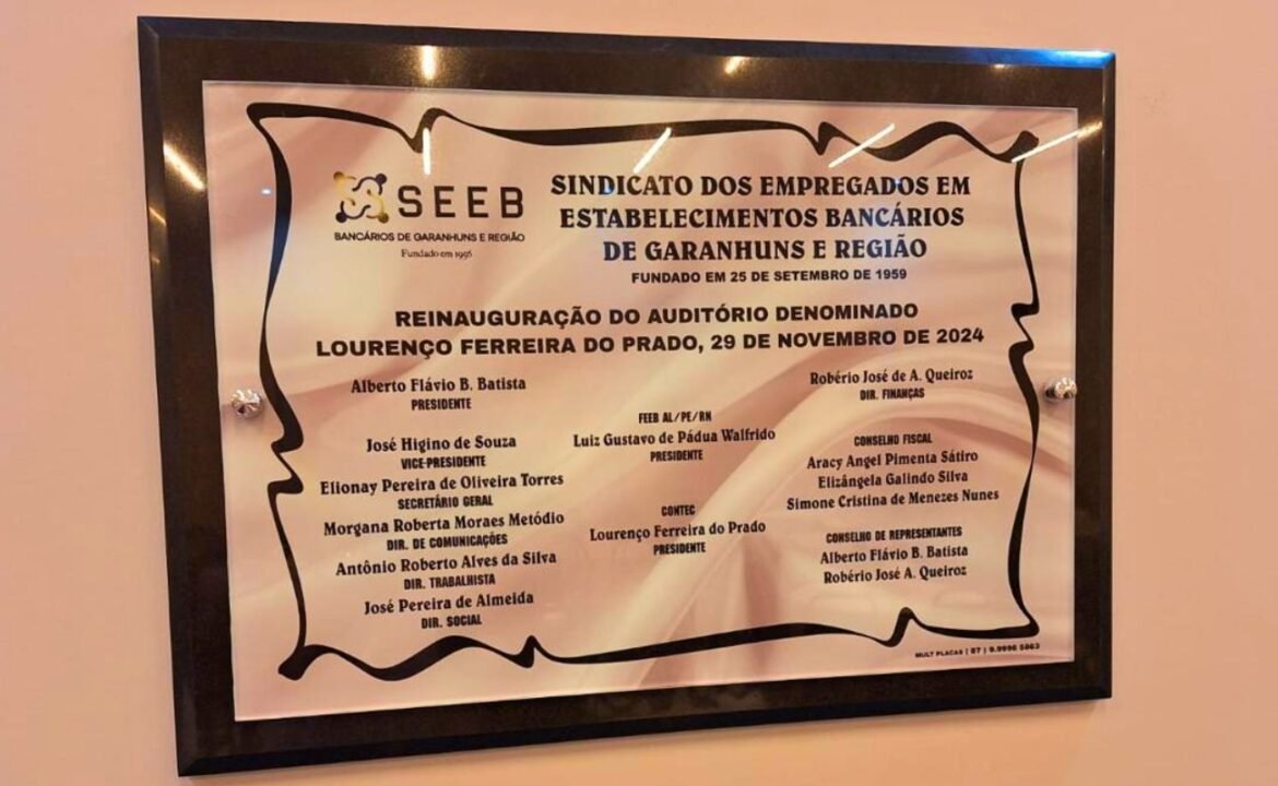 Nesta sexta-feira, 29 de novembro, o Sindicato dos Empregados em Estabelecimentos Bancários de Garanhuns e Região realizou a reinauguração de seu auditório, agora denominado Auditório Lourenço Ferreira do Prado, em homenagem ao presidente da CONTEC.